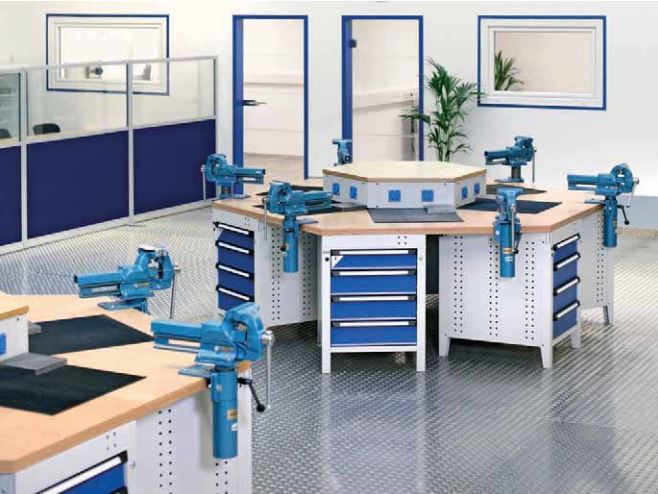 Les établis teamwork permettent d'avoir un large plan de travail hexagonal pour le travail en équipe. Chaque poste est équipé d'un caisson de rangement.