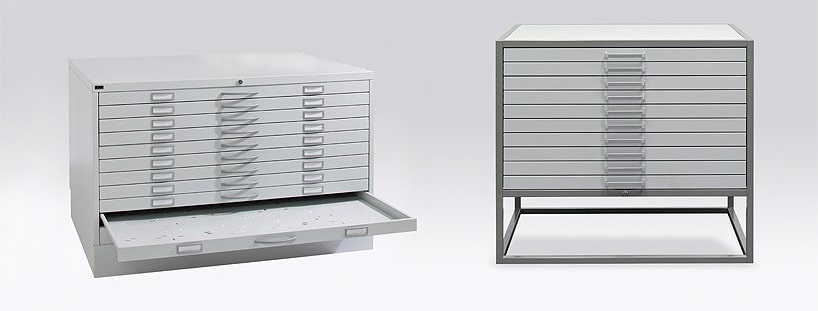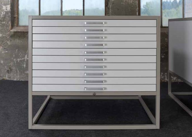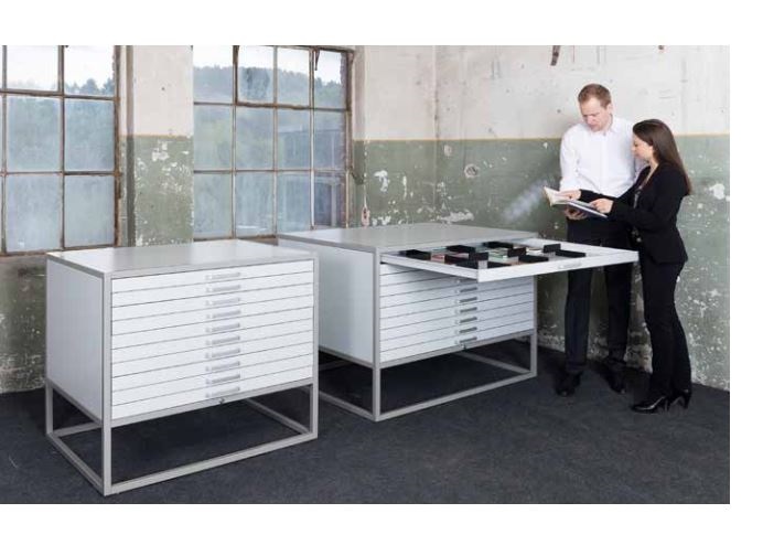 Vous souhaitez conserver vos documents importants correctement et en toute sécurité ? Aucun problème avec le meuble d'archivage plat PLANOFLAT KIND. Les modèles pour les formats DIN A1 et DIN A0 se combinent parfaitement avec deux hauteurs de tiroir différentes. Grâce à la structure affinée du cadre, jusqu'à 3 meubles peuvent être empilés l'un sur l'autre. Les modèles de tiroir montés sur roulement à billes et pourvus d'un revêtement spécial en plastique garantissent un glissement silencieux. Ces meubles permettent également le stockage de petites pièces, peuvant être compartimentés plusieurs fois sur la hauteur.