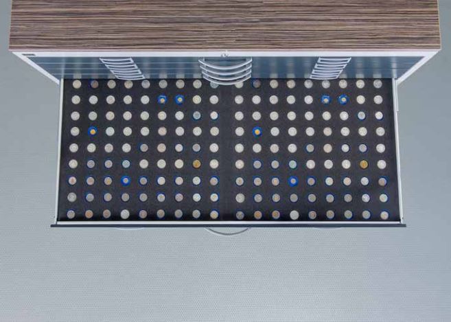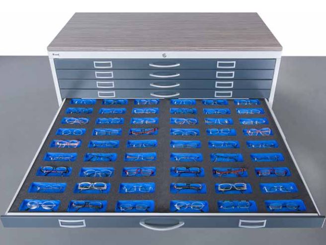 Les tiroirs peuvent être équipés par différents systèmes de compartimentage pour passer à des formats plus petit DIN A2, A3 et A4.